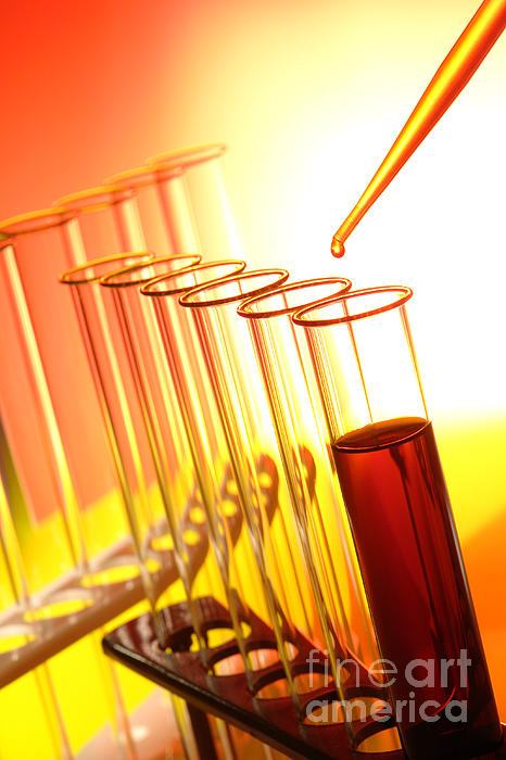 Pipette full of orange liquid with drop of chemical dripping above laboratory test tubes on a rack for a scientific chemistry experiment in a science research lab